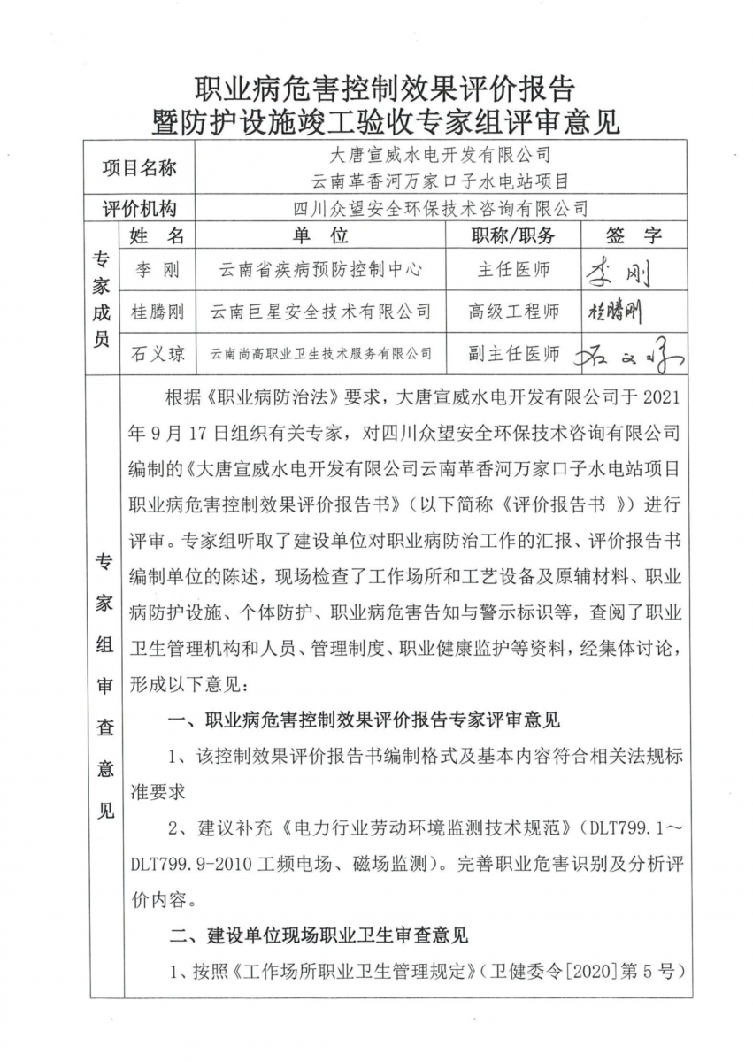 云南革香河萬家口子水電站項目職業(yè)病危害控制效果評價報告 |
