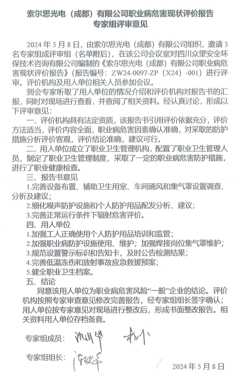 索爾思光電(成都)有限公司職業(yè)病危害現(xiàn)狀評價(jià) |