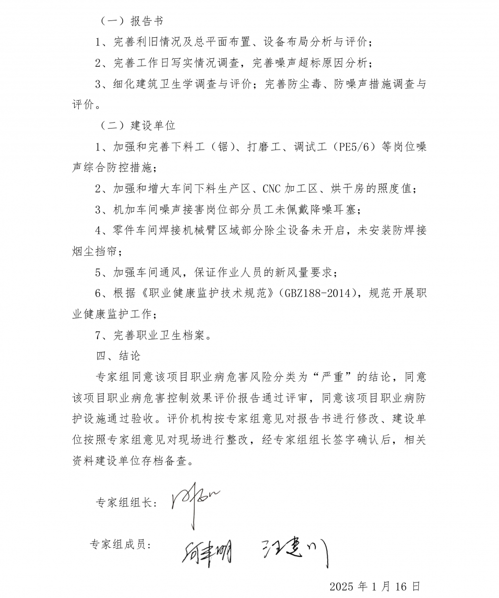 結(jié)論:項目控制效果評價判定為“職業(yè)病危害風(fēng)險分類嚴重”的建設(shè)項目。 根據(jù)對本項目現(xiàn)場調(diào)查、職業(yè)病危害因素檢測結(jié)果和項目相關(guān)資料的綜合分析,本項目職業(yè)衛(wèi)生防治工作符合國家法律、法規(guī)的相關(guān)規(guī)定,采取的職業(yè)病防治措施基本可行,日常運行過程中在一定程度上能控制和降低職業(yè)病危害因素對作業(yè)人員健康的影響,項目在落實了本次評價報告提出的補充措施和建議后,能夠滿足職業(yè)病防治工作的需要。本項目已具備職業(yè)病防護設(shè)施竣工驗收的條件。 建議: (1)車間加強通風(fēng)要求,保證作業(yè)人員的新風(fēng)量要求。 (2)根據(jù)《職業(yè)健康監(jiān)護技術(shù)規(guī)范》(GBZ188-2014)結(jié)合項目實際情況,做好健康監(jiān)護工作,“兩檔”管理制度。“兩檔”內(nèi)容包括職業(yè)衛(wèi)生檔案和職業(yè)健康監(jiān)護檔案。 (3)按照《用人單位職業(yè)健康監(jiān)護監(jiān)督管理辦法》(國家安監(jiān)總局令〔2012〕第49號)、《職業(yè)健康監(jiān)護技術(shù)規(guī)范》(GBZ188-2014)相關(guān)規(guī)定對新進或調(diào)崗作業(yè)人員進行崗前體檢、并對離崗或調(diào)離作業(yè)人員進行離崗健康檢查。 (4)建設(shè)單位應(yīng)按照《工作場所職業(yè)衛(wèi)生管理規(guī)定》(國家衛(wèi)生健康委員會令〔2020〕第5號)的規(guī)定:職業(yè)病危害嚴重的用人單位,應(yīng)當(dāng)委托具有相應(yīng)資質(zhì)的職業(yè)衛(wèi)生技術(shù)服務(wù)機構(gòu),每年至少進行一次職業(yè)病危害因素檢測,每三年至少進行一次職業(yè)病危害現(xiàn)狀評價。檢測、評價結(jié)果應(yīng)當(dāng)存入本單位職業(yè)衛(wèi)生檔案,并向衛(wèi)生健康主管部門報告和勞動者公布。 (5)建設(shè)單位應(yīng)根據(jù)《職業(yè)病危害項目申報辦法》(國家安全生產(chǎn)監(jiān)督管理總局令第48號)的規(guī)定,將此次控制效果評價報告與職業(yè)病危害因素現(xiàn)場檢測結(jié)果向當(dāng)?shù)刂鞴懿块T進行申報。 (6)根據(jù)《國家衛(wèi)生健康委辦公廳關(guān)于進一步加強用人單位職業(yè)健康培訓(xùn)工作的通知》國衛(wèi)辦職健函〔2022〕441號的要求進行職業(yè)衛(wèi)生培訓(xùn)。 (7)定期對除塵、廢氣處理設(shè)施進行檢查、維護,發(fā)現(xiàn)有堵塞、損壞或其他原因?qū)е虏荒苷9ぷ鞯?,?yīng)及時進行清理、設(shè)備維修,并做好相關(guān)維護保養(yǎng)記錄。 (8)加強噪聲作業(yè)人員的個體防護和職業(yè)健康監(jiān)護。 (9)加強外委作業(yè)人員的職業(yè)衛(wèi)生管理,對焊工、打磨工加強個體防護和職業(yè)健康監(jiān)護。 (10)建設(shè)單位應(yīng)加強女工的勞動保護,不得安排孕期、哺乳期的女職工從事對本人和胎兒、嬰兒有危害的作業(yè)。 (11)應(yīng)急救援物資的使用人員,應(yīng)接受相應(yīng)的培訓(xùn),熟悉裝備的用途、技術(shù)性能及有關(guān)使用說明資料,并遵守操作規(guī)程;及時對車間內(nèi)配備的應(yīng)急救援藥箱進行檢查,對應(yīng)急救援藥品進行有效性查驗,及時補充更換。 (12)粉塵防爆措施嚴格以安全評價報告、安全設(shè)施設(shè)計專篇提出的措施為準。 (13)針對維修、清污存在的受限空間作業(yè)危害,應(yīng)加強受限空間作業(yè)監(jiān)管,嚴格按照《缺氧危險作業(yè)安全規(guī)程》(GB8958-2006)、《密閉空間作業(yè)職業(yè)危害防護規(guī)范》(GBZ/T205-2007)進行作業(yè)。 (14)本次職業(yè)病危害控制效果評價只針對目前生產(chǎn)狀況,公司今后遇單位名稱、法定代表人或者負責(zé)人發(fā)生變更,須按時申報;或因技術(shù)、工藝或原輔材料發(fā)生改變而引起職業(yè)病危害因素發(fā)生變化時,應(yīng)進一步進行職業(yè)病危害因素評價。 |