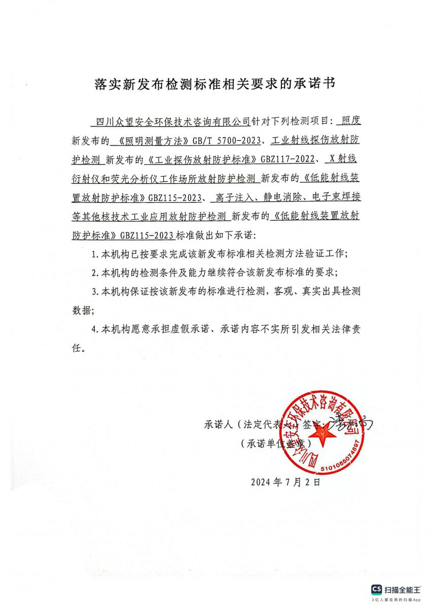 當(dāng)前所在的位置:網(wǎng)站首頁 > 檢測中心落實(shí)照度、工業(yè)射線探傷放射防護(hù)檢測、X射線衍射儀和熒光分析儀工作場所放射防護(hù)檢測、離子注入、靜電消除、電子?xùn)|焊接等其他核技術(shù)工業(yè)應(yīng)用放射防護(hù)檢測新發(fā)布檢測標(biāo)準(zhǔn)相關(guān)要求的承諾書